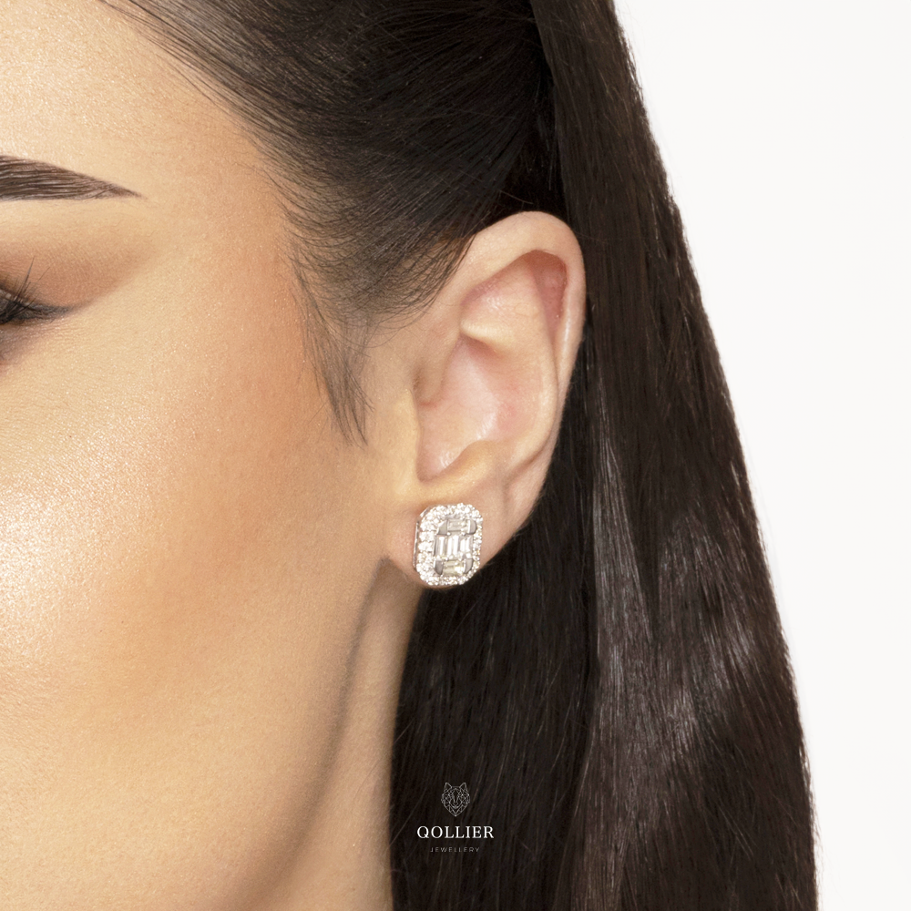 حلق ذهب أبيض عيار 18 وألماس مدور وباجيت VS-SI