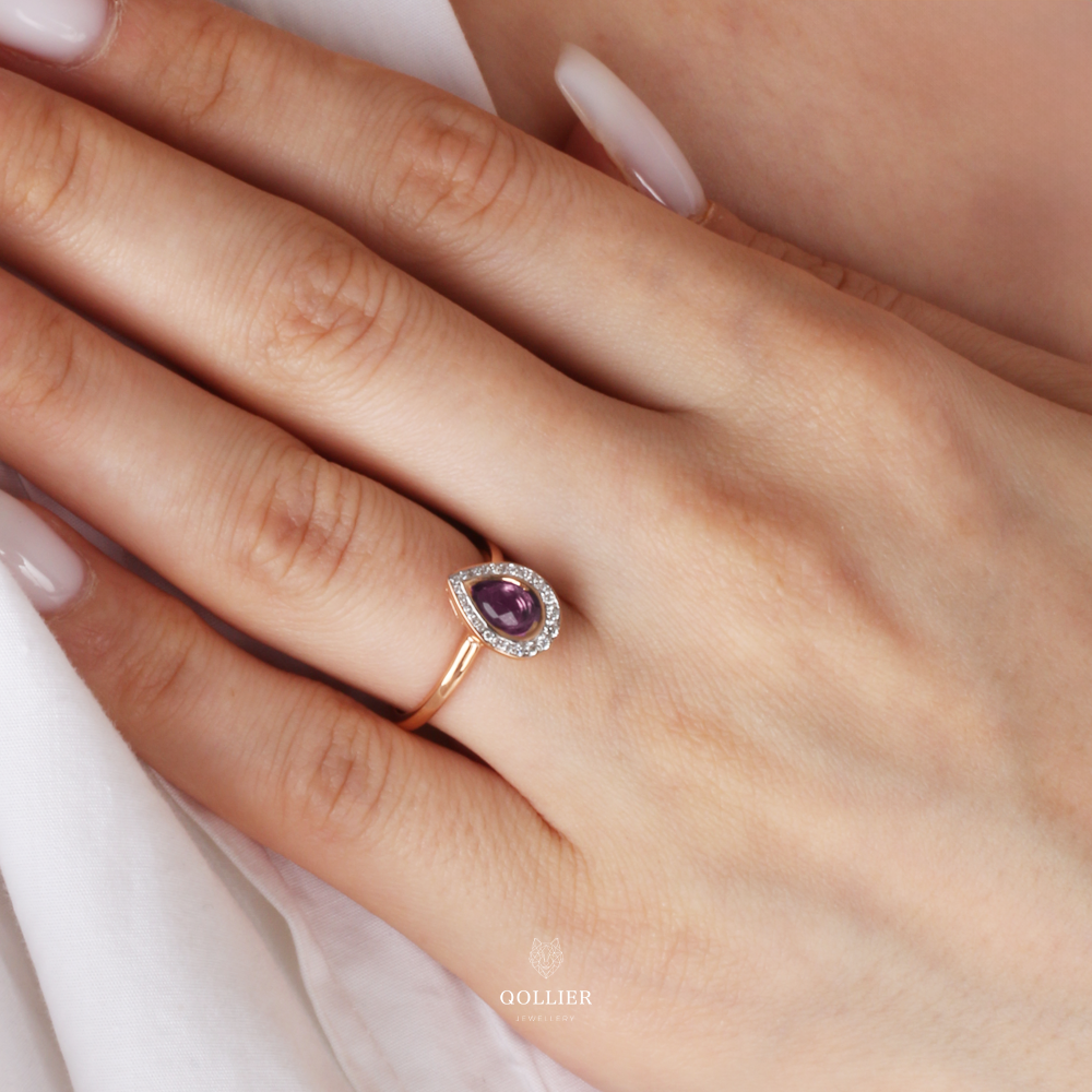 خاتم بشكل دمعة مزين بحجر الاماتيست المميز محاط بألماسات مدورة.